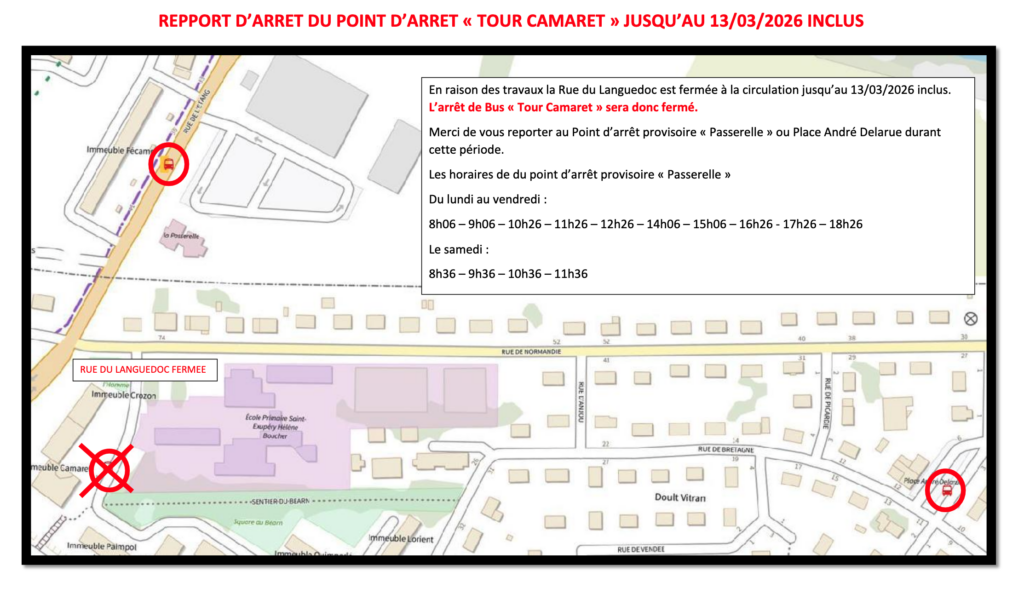 ⚠️ En raison des travaux sur le réseau de chaleur,  la rue du Languedoc est fermée à la circulation jusqu’au 13/03/2026 inclus. L’arrêt de Bus « Tour Camaret » est donc également fermé.
